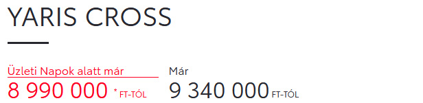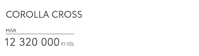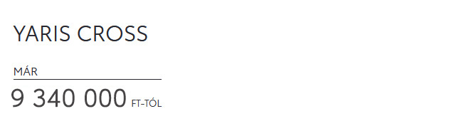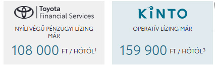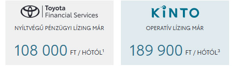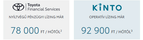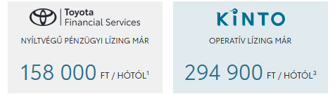 2 A Toyota Pénzügyi Zrt. üzleti (fogyasztónak nem minősülő) ügyfeleknek szóló, rögzített kamatozású nyíltvégű pénzügyi lízing kalkulációja, amely teljes körű Toyota Casco biztosítás megkötése és teljes futamidő alatti fenntartása esetén érvényes, Toyota Easy Programban. A THM meghatározása az aktuális feltételek, illetve a hatályos jogszabályok figyelembe vételével történt, a feltételek változása esetén a mértéke módosulhat. A kalkuláció tájékoztató jellegű, nem minősül ajánlattételnek. A Toyota Pénzügyi Zrt. a kondíciók változtatásának és a hitelbírálat jogát fenntartja. A pénzügyi lízing részletes szabályait a vonatkozó szerződéses dokumentumok tartalmazzák. További részletek a toyotahitel.hu oldalon és a Toyota márkakereskedésekben.