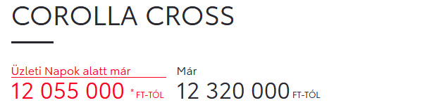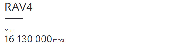 3 A szolgáltatást a Toyota Mobility Services Hungary Kft. (Szolgáltató) nyújtja. A kalkuláció tájékoztató jellegű, a felek között nem keletkeztet szerződéses jogviszonyt, és a kalkuláció készítésének időpontjában ismert költségeken alapul. A költségek változása esetén a Szolgáltató jogosult az ajánlat adatainak módosítására. Így különösen, de nem kizárólag jogosult a bérleti díjak megváltoztatására, amennyiben az ajánlatban figyelembe vett gépjárművek listára megváltozik, vagy amennyiben a refinanszírozási kamatlábak, illetve az adók megváltoznak. A kiemelt ajánlatok a legkésőbb 2025.10.31-vel bezárólag a Szolgáltatóval megkötött Egyedi Bérleti Szerződés esetén, avagy a Szolgáltató általi visszavonásig érvényesek. A Márkakerekedésben elkészített ajánlat az azon ajánlat elkészítésének időpontjában ismert feltételeknek megfelelően módosulhat. Jelen kalkuláció elkészítésének dátuma: 2025.07.14.