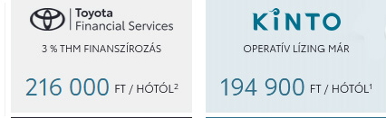 2 A Toyota Pénzügyi Zrt. üzleti (fogyasztónak nem minősülő) ügyfeleknek szóló, rögzített kamatozású zártvégű pénzügyi lízing kalkulációja, amely teljes körű casco biztosítás megkötése és teljes futamidő alatti fenntartása esetén érvényes. A THM meghatározása az aktuális feltételek, illetve a hatályos jogszabályok figyelembe vételével történt, a feltételek változása esetén a mértéke módosulhat. A kalkuláció tájékoztató jellegű, nem minősül ajánlattételnek. A Toyota Pénzügyi Zrt. a kondíciók változtatásának és a hitelbírálat jogát fenntartja. A pénzügyi lízing részletes szabályait a vonatkozó szerződéses dokumentumok tartalmazzák. További részletek a toyotahitel.hu oldalon és a Toyota Márkakereskedésekben.