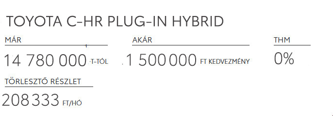⁵ Ajánlatunk 2026. január 15 és február 28. között vagy visszavonásig magánszemélyként megkötött lízingszerződésekre érvényes, kizárólag Toyota C-HR PHEV, Camry, Prius, bZ4X, Proace City Verso EV és Proace Verso EV modellekre. A finanszírozási ajánlat alapja a Toyota Pénzügyi Zrt. forint alapú, rögzített kamatozású zártvégű pénzügyi lízing kalkulációja, ami teljes körű casco biztosítás megkötése és teljes futamidő alatti fenntartása esetén érvényes. Feltételek – futamidő: 24 hónap, finanszírozott összeg: 5.000.000 Ft. Reprezentatív példa zártvégű pénzügyi lízing esetén rögzített kamatozással, a példa számítás eltér a THM rendeletben foglalt feltételektől, mivel azon feltételekkel a finanszírozó nem nyújt finanszírozást: finanszírozott összeg: 5.000.000 Ft, futamidő: 24 hónap, havi lízingdíj: 208.333 Ft, rögzített kamatozású ügyleti kamat: 0,0%, THM: 0,0%, lízingbevevő által fizetendő teljes összeg: 5.000.000 Ft, casco biztosítás megkötése és fenntartása mellett. Hitelbiztosítéki nyilvántartásba történő bejegyzés ügyfél által, az első fizetési ütem időpontjában fizetendő összege: 0 Ft. A teljes hiteldíj mutató meghatározása az aktuális feltételek, illetve hatályos jogszabályok figyelembevételével történt, a feltételek változása esetén mértéke módosulhat. A casco biztosítás díja előre nem ismert, így azt a THM nem tartalmazza. A hirdetés nem minősül a Ptk. 6:64. §-a szerinti ajánlattételnek, és az abban foglaltakat a Toyota Pénzügyi Zrt. külön tájékoztatás nélkül is visszavonhatja. Jelen ajánlatban meghatározott feltételek a lejárat időpontjáig benyújtott finanszírozási kérelmek esetén alkalmazandók, amennyiben az ügyfél megfelel a bírálati feltételeknek. A Toyota Pénzügyi Zrt. mindenkor hatályos Általános Szerződési Feltételei, Üzletszabályzata, és Hirdetménye elérhetőek a toyotahitel.hu oldalon. A tájékoztatás nem teljeskörű, további feltételekért és részletekért keresse fel Toyota Márkakereskedését.