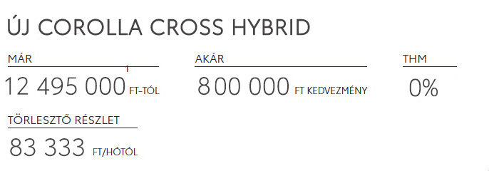 ⁴ Ajánlatunk 2026. január 15 és február 28. között vagy visszavonásig magánszemélyként megkötött lízingszerződésekre érvényes, kizárólag Toyota Corolla SD/HB/TS, Corolla Cross, C-HR HEV modellekre. A finanszírozási ajánlat alapja a Toyota Pénzügyi Zrt. forint alapú, rögzített kamatozású zártvégű pénzügyi lízing kalkulációja, ami teljes körű casco biztosítás megkötése és teljes futamidő alatti fenntartása esetén érvényes. Feltételek – futamidő: 24 hónap, finanszírozott összeg: 4.000.000 Ft. Reprezentatív példa zártvégű pénzügyi lízing esetén rögzített kamatozással, a példa számítás eltér a THM rendeletben foglalt feltételektől, mivel azon feltételekkel a finanszírozó nem nyújt finanszírozást: finanszírozott összeg: 4.000.000 Ft, futamidő: 24 hónap, havi lízingdíj: 166.667 Ft, rögzített kamatozású ügyleti kamat: 0,0%, THM: 0,0%, lízingbevevő által fizetendő teljes összeg: 4.000.000 Ft, casco biztosítás megkötése és fenntartása mellett. Hitelbiztosítéki nyilvántartásba történő bejegyzés ügyfél által, az első fizetési ütem időpontjában fizetendő összege: 0 Ft. A teljes hiteldíj mutató meghatározása az aktuális feltételek, illetve hatályos jogszabályok figyelembevételével történt, a feltételek változása esetén mértéke módosulhat. A casco biztosítás díja előre nem ismert, így azt a THM nem tartalmazza. A hirdetés nem minősül a Ptk. 6:64. §-a szerinti ajánlattételnek, és az abban foglaltakat a Toyota Pénzügyi Zrt. külön tájékoztatás nélkül is visszavonhatja. Jelen ajánlatban meghatározott feltételek a lejárat időpontjáig benyújtott finanszírozási kérelmek esetén alkalmazandók, amennyiben az ügyfél megfelel a bírálati feltételeknek. A Toyota Pénzügyi Zrt. mindenkor hatályos Általános Szerződési Feltételei, Üzletszabályzata, és Hirdetménye elérhetőek a toyotahitel.hu oldalon. A tájékoztatás nem teljeskörű, további feltételekért és részletekért keresse fel Toyota Márkakereskedését.