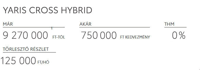 ³ Ajánlatunk 2026. január 15 és február 28. között vagy visszavonásig magánszemélyként megkötött lízingszerződésekre érvényes, kizárólag Toyota Yaris, Yaris Cross modellekre. A finanszírozási ajánlat alapja a Toyota Pénzügyi Zrt. forint alapú, rögzített kamatozású zártvégű pénzügyi lízing kalkulációja, ami teljes körű casco biztosítás megkötése és teljes futamidő alatti fenntartása esetén érvényes. Feltételek – futamidő: 24 hónap, finanszírozott összeg: 3.000.000 Ft. Reprezentatív példa zártvégű pénzügyi lízing esetén rögzített kamatozással, a példa számítás eltér a THM rendeletben foglalt feltételektől, mivel azon feltételekkel a finanszírozó nem nyújt finanszírozást: finanszírozott összeg: 3.000.000 Ft, futamidő: 24 hónap, havi lízingdíj: 125.000 Ft, rögzített kamatozású ügyleti kamat: 0,0%, THM: 0,0%, lízingbevevő által fizetendő teljes összeg: 3.000.000 Ft, casco biztosítás megkötése és fenntartása mellett. Hitelbiztosítéki nyilvántartásba történő bejegyzés ügyfél által, az első fizetési ütem időpontjában fizetendő összege: 0 Ft. A teljes hiteldíj mutató meghatározása az aktuális feltételek, illetve hatályos jogszabályok figyelembevételével történt, a feltételek változása esetén mértéke módosulhat. A casco biztosítás díja előre nem ismert, így azt a THM nem tartalmazza. A hirdetés nem minősül a Ptk. 6:64. §-a szerinti ajánlattételnek, és az abban foglaltakat a Toyota Pénzügyi Zrt. külön tájékoztatás nélkül is visszavonhatja. Jelen ajánlatban meghatározott feltételek a lejárat időpontjáig benyújtott finanszírozási kérelmek esetén alkalmazandók, amennyiben az ügyfél megfelel a bírálati feltételeknek. A Toyota Pénzügyi Zrt. mindenkor hatályos Általános Szerződési Feltételei, Üzletszabályzata, és Hirdetménye elérhetőek a toyotahitel.hu oldalon. A tájékoztatás nem teljeskörű, további feltételekért és részletekért keresse fel Toyota Márkakereskedését.